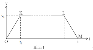 Ca-bin thang máy tòa nhà A của Trường Phổ thông Năng khiếu đi từ tầng 1 lên tầng 8 hết 25 s, từ tầng 1 lên tầng 7 hết \(21\dfrac{2}{3}\,\,\,s\) (hai tầng liên tiếp cách nhau 4,5 m). Mỗi lần xuất phát cho đến khi dừng lại (đi lên cũng như đi xuống) đồ thị tốc độ v của ca-bin (CB) theo thời gian t luôn là một hình thang cân như Hình 1. (Chiều dài đoạn KL tùy thuộc quãng đường di chuyển; v1, t1 là những hằng số chưa biết, có giá trị như nhau đối với mọi quá trình chuyển động của thang máy.