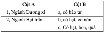 Nối tên Ngành thực vật ở cột A với đặc điểm đặc trưng tương ứng ở cột B cho phù