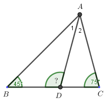 Cho \(\Delta ABC\) có \(\angle B = {45^0},\angle C = {75^0}.\) Tia \(AD\) là tia phân giác của \(\angle BAC\left( {D \in BC} \right).\) Khi đó số đo của \(\angle ADB\) là: