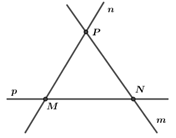 b) Điểm \(P\) nằm trên cả hai đường thẳng \(m,\,\,n\) và không thuộc đường thẳng \(p\); điểm \(M\) thuộc cả hai đường thẳng \(n,\,\,p\) và nằm ngoài đường thẳng \(m\); hai đường thẳng \(p,\,\,m\) cùng đi qua điểm \(N\) còn đường thẳng \(n\) không chứa điểm \(N\).