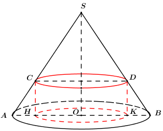 Cho hình nón có đường cao bằng 3, bán kính đường tròn đáy bằng 2. Hình trụ (T) nội tiếp