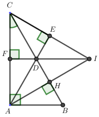 d) Từ \(D\) kẻ \(DF\) vuông góc với \(AC\) (\(F\,\)thuộc \(AC\)), \(I\) là giao điểm của \(CE\) và \(AH.\) Chứng minh ba điểm \(I,\,D,\,F\) thẳng hàng.