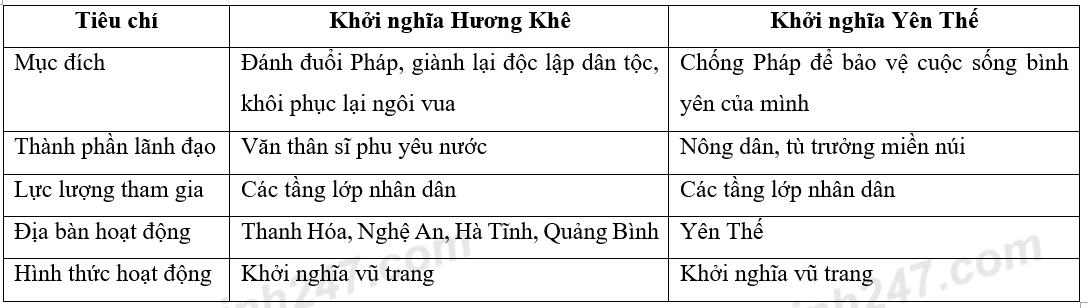 Lập bảng so sánh khởi nghĩa Hương Khê và cuộc khởi nghĩa Yên Thế theo các tiêu chí sau: mục đích đấu tranh, thành phần lãnh đạo, lực lượng tham gia, địa bàn hoạt động