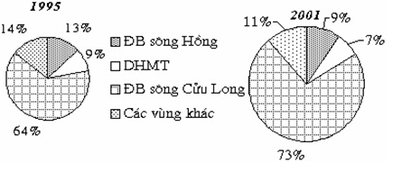 Căn cứ vào biểu đồ, hãy cho biết nhận xét nào sau đây đúng về sự thay đổi cơ cấu diện tích nuôi trồng thuỷ, hải sản của nước ta phân theo các vùng năm 1995 và 2001?