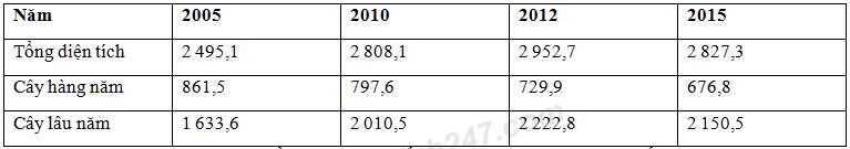 Cho bảng số liệu: DIỆN TÍCH CÂY CÔNG NGHIỆP CỦA NƯỚC TA GIAI ĐOẠN 2005 – 2015 (Đơn vị: