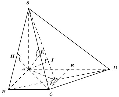 b) Chứng minh \(AC \bot CD\). Trong (SAC) kẻ \(AK \bot SC\) \(\left( {K \in SC} \right)\). Chứng minh \(AK \bot \left( {SCD} \right)\). Sử dụng hệ thức lượng trong tam giác vuông để tính AK.
