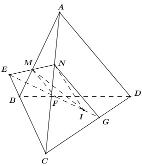 Cho bốn điểm \(A,B,C,D\) không đồng phẳng. Lấy \(M \in AB,N \in AC,I \in \left( {BCD} \right).\) Giả