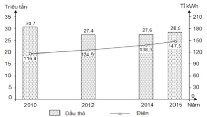 Cho biểu đồ về dầu thô, điện của Ma-lai-xi-a, giai đoạn 2010 – 2015 (Nguồn số liệu theo