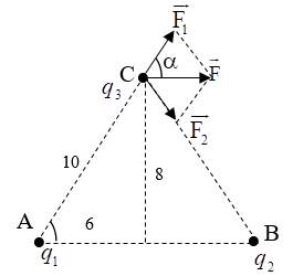 Đặt hai điện tích điểm \({q_1}\; = - {q_2}\; = {2.10^{ - 8}}C\) tại A, B trong không khí cách nhau 12 cm. Xác định lực điện tác dụng lên \({q_3}\; = {4.10^{ - 8}}\;C\) tại C mà CA = CB = 10 cm.
