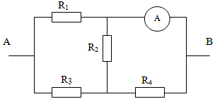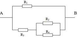 Cho mạch điện như hình vẽ: \({R_1} = 5\Omega ;{R_2} = {R_4} = 10\Omega ;{R_3} = 8\Omega \). Ampe kế có điện trở không đáng kể. Tính điện trở tương đương của mạch AB.