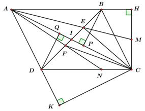b) Trên hai đoạn thẳng \(BC,CD\) lần lượt lấy hai điểm \(M,N\,\,\,\left( {M \ne B,\,\,C} \right)\) sao cho hai tam giác \(ABM\) và \(ACN\) có diện tích bằng nhau; \(BD\) cắt \(AM\) và \(AN\) lần lượt tại \(E,F.\) Chứng minh \(\frac{{BM}}{{BC}} + \frac{{DN}}{{DC}} = 1\) và \(BE + DF > EF.\)