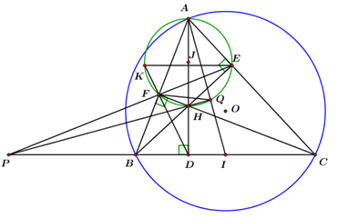 Cho tam giác \(ABC\,\,\,\left( {AB < AC} \right)\) nội tiếp đường tròn \(\left( O \right)\) và có trực tâm \(H.\) Ba điểm \(D,E,F\)lần lượt là chân các đường cao vẽ từ \(A,B,C\) của tam giác \(ABC.\) Gọi \(I\) là trung điểm cạnh \(BC,P\) là giao điểm của \(EF\) và \(BC.\) Đường thẳng \(DF\) cắt đường tròn ngoại tiếp tam giác \(HEF\) tại điểm thứ hai là \(K\).