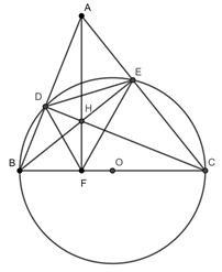 Cho \(\Delta ABC\) có ba góc nhọn. Vẽ đường tròn \(\left( O \right)\) đường kính \(BC,\) đường tròn cắt \(AB\) và \(AC\) lần lượt ở \(D\) và \(E;\,\,BE\) và \(CD\) cắt nhau tại \(H.\)