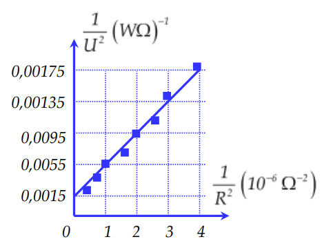 Sử dụng các vị trí tại \(\frac{1}{{{R^2}}} = 1\) thì \(\frac{1}{{{U^2}}} = 0,0055\) và tại \(\frac{1}{{{R^2}}} = 2\) thì \(\frac{1}{{{U^2}}} = 0,0095\) ta tìm được C.