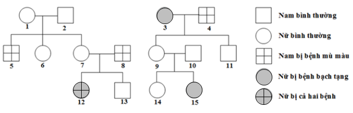 Câu 117: Sơ đồ phả hệ hình bên mô tả hai bệnh di truyền ở người, bệnh bạch tạng do một trong 2 alen của một gen quy định, bệnh mù màu do một trong 2 alen của một gen nằm trên vùng không tương đồng của nhiễm sắc thể giới tính X quy định. Theo lí thuyết, có bao nhiêu phát biểu sau đây đúng?