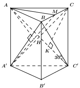 Cho hình lăng trụ đứng ABC.A’B’C’ có đáy \(\Delta ABC\) vuông cân tại A, AB = AC = a. Biết góc \(\angle \left( {BC';\left( {ACC'A'} \right)} \right) = {30^0}\). M là trung điểm B’C’. Tính: