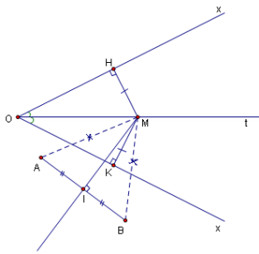 Cho một góc \(xOy\) và hai điểm \(A,\,\,B\). Dựng 1 điểm cách đều 2 cạnh \(Ox,\,\,Oy\) và cách