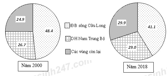 Căn cứ vào biểu đồ, hãy cho biết nhận xét nào dưới đây không đúng về cơ cấu sản lượng thủy sản khai thác phân theo vùng ở nước ta giai đoạn 2000 – 2018?