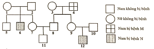 Phả hệ dưới đây mô tả sự di truyền của bệnh M và bệnh N ở người, mỗi bệnh đều do 1
