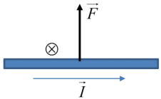 Trong hình vẽ bên, AB là một đoạn dây dẫn thẳng, dòng điện chạy theo chiều từ A đến B. Các đường sức từ nằm vuông góc với mặt phẳng của hình vẽ và có chiều từ ngoài vào trong. Chiều của lực từ tác dụng lên đoạn dây AB được biểu diễn theo