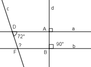 Biết \(a \bot d,\,b \bot d,\,\widehat {A{\rm{D}}F} = {72^0}\). Tính \(\widehat {DFB}\).