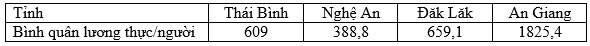 Theo bảng số liệu, nhận xét nào sau đây đúng khi so sánh bình quân lương thực/người (kg/gười) của các tỉnh