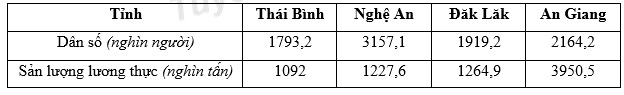 Cho bảng số liệu: DÂN SỐ VÀ SẢN LƯỢNG LƯƠNG THỰC CỦA MỘT SỐ TỈNH NĂM 2018 (Nguồn: Niên