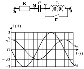 Cho mạch điện như hình vẽ. Điện áp xoay chiều ổn định giữa hai đầu A và B là \(u = 120\sqrt 3 cos\left( {\omega t + \varphi } \right)\left( V \right)\) . Khi K mở hoặc đóng thì đồ thị cường độ dòng điện qua mạch theo thời gian tương ứng là \({i_m}\) và \({i_d}\) được biểu diễn như hình bên. Giá trị của R bằng: