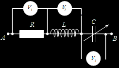 Một đoạn mạch mắc nối tiếp gồm ba phần tử R, L và C như hình vẽ. Đặt vào hai đầu đoạn mạch một điện áp xoay chiều có giá trị hiệu dụng và tần số không đổi. Cố định R, L thì thấy chỉ số của các vôn kế lí tưởng tăng đến giá trị cực đại rồi giảm. Thứ tự cực đại xảy ra trên các vôn kế sẽ là: