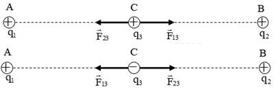 + Nếu \({q_1};{q_2}\) trái dấu \( \Rightarrow \) q0 nằm ngoài q1 và q2 và gần điện tích có độ lớn nhỏ hơn.