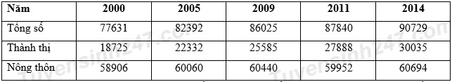 Để thể hiện sự thay đổi cơ cấu dân số theo thành thị và nông thôn của nước ta giai đoạn 2000 – 2014, biểu đồ thích hợp là: