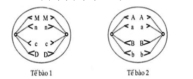 Hình dưới đây mô tả hai tế bào ở hai cơ thể lưỡng bội đang phân bào. Biết rằng không xảy ra đột biến, các chữ cái A, a, B, b, c, D, M, n kí hiệu cho các nhiễm sắc thể. Phát biểu nào sau đây đúng?