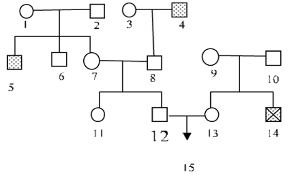 Cá thể số (4), (5) bị bệnh bạch tạng, cá thể số (14) mắc các bệnh bạch tạng và bệnh mù màu đỏ xanh lục. Biết rằng bệnh bạch tạng do gen lặn a nằm trên NST thường quy định, bệnh mù màu đỏ - xanh lục do gen b nằm trên vùng không tương đồng của NST X quy định. Xác suất cá thể số (15) không mang alen bệnh là bao nhiêu?
