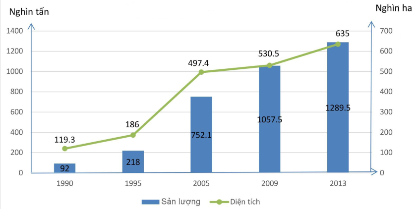 Cho biểu đồ: Diện tích gieo trồng và sản lượng cà phê nhân của nước ta giai đoạn 1990
