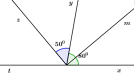 Cho \(\angle xOy = 80^\circ \) và \(\angle yOz = 50^\circ \), tai \(Oy\) nằm giữa hai tia \(Ox\) và \(Oz\).
