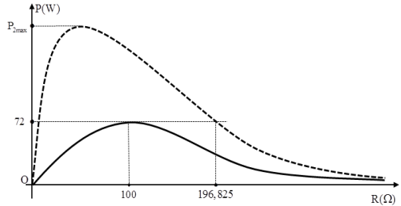 Cho mạch điện gồm: biến trở R, cuộn cảm thuần và tụ điện mắc nối tiếp (cảm kháng luôn khác dung kháng). Điện áp xoay chiều đặt vào có giá trị hiệu dụng U không đổi nhưng tần số thay đổi được. Lúc đầu, cho \(f = {f_1}\) và điều chỉnh R thì công suất tiêu thụ trên mạch thay đổi theo R là đường liền nét ở hình bên. Khi \(f = {f_2}\left( {{f_1} \ne {f_2}} \right)\) và cho R thay đổi, đường biểu diễn sự phụ thuộc của công suất theo R là đường đứt nét. Công suất tiêu thụ lớn nhất của mạch khi \(f = {f_2}\) nhận giá trị nào sau đây?