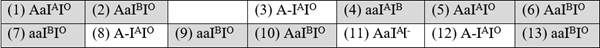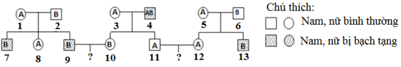 Ở người, tính trạng nhóm máu do một gen có 3 alen nằm trên NST thường quy định, alen IA quy định nhóm máu A, alen IB quy định nhóm máu B, alen IO quy định nhóm máu O, trong đó IA và IB có quan hệ đồng trội, còn IO lặn so với IA và IB. Gen gây bệnh bạch tạng nằm trên một NST thường khác. Trong sơ đồ phả hệ dưới đây, các chữ cái biểu thị nhóm máu của từng cá thể.