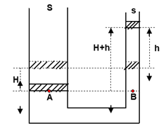 Máy nén thuỷ lực đổ đầy dầu, tiết diện các pit tông là \(S = 1\,\,{m^2}\) và \(s = 0,2\,\,{m^2}\), các pít tông có khối lượng không đáng kể. Ban đầu hai pít tông có độ cao như nhau. Một người khối lượng \(54\,\,kg\) đứng trên pit tông lớn thì pit tông nhỏ nâng lên một đoạn là bao nhiêu? Cho khối lượng riêng của dầu \(D = 0,9{\rm{ }}g/c{m^3}\).