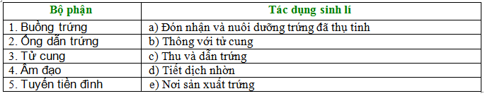 Cho một số bộ phận trong cơ quan sinh dục nữ và tác dụng sinh lí Hãy sắp xếp các bộ