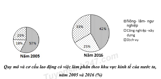 Căn cứ vào biểu đồ, cho biết nhận xét nào sau đây đúng về quy mô lao động và sự chuyển dịch cơ cấu lao động của nước ta, giai đoạn 2005-2016