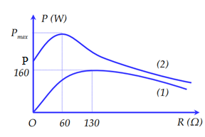 Cho đoạn mạch AB nối tiếp gồm biến trở R, cuộn dây có điện trở r có độ tự cảm L và tụ điện có điện dung C. Đặt vào hai đầu đoạn mạch AB một điện áp xoay chiều \(u = U\sqrt 2 .\cos \omega t\) (U và ω không đổi). Cho R biến thiên, đồ thị biểu diễn công suất tiêu thụ trên R (đường 1) và công suất tiêu thụ trên toàn mạch (đường 2) như hình vẽ. Giá trị của P là