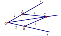 Cho \(\widehat {xOy} = {50^0}\), vẽ cung tròn tâm O bán kính bằng 2cm, cung tròn này cắt Ox, Oy lần lượt ở A và B. Vẽ các cung tròn tâm A và tâm B có bán kính 3cm, chúng cắt nhau tại điểm C nằm trong góc xOy. Tính \(\widehat {xOC}\) .