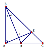 Cho tam giác \(ABC\) có \(\widehat A = {90^0}\), tia phân giác \(BD\) của góc \(B\) (\(D \in AC\)). Trên cạnh \(BC\) lấy điểm \(E\) sao cho \(BE = BA.\) Hai góc nào sau đây bằng nhau?