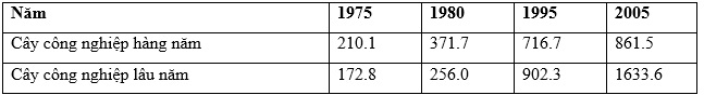 Cho bảng số liệu: Diện tích cây công nghiệp của nước ta giai đoạn 1975 – 2005 (Đơn vị: