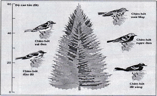 Cho hình vẽ sau về sự phân chia vùng dinh dưỡng của 5 loài chim hót Bắc Mĩ.