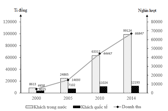 Cho biểu đồ: Số khách du lịch và doanh thu du lịch của nước ta giai đoạn 2000-2014.