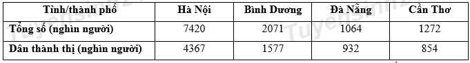 Cho bảng số liệu: Dân số và dân số thành thị một số tỉnh, thành phố của nước ta năm
