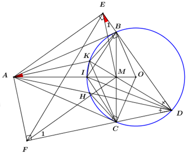 3) Gọi \(\left\{ H \right\} = AD \cap \left( O \right)\). Chứng minh \(\angle KDE = \angle ADF\), từ đó chứng minh cung \(KI = \) cung \(HI\), từ đó chứng minh \(DI\) là phân giác của góc \(KDH\).