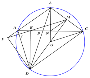 Tam giác \(ABC\) nội tiếp đường tròn \(\left( T \right)\) có tâm \(O\) có \(AB = AC\) và \(\angle BAC > {90^0}\). Gọi \(M\) là trung điểm của \(AC\), tia \(MO\) cắt \(\left( T \right)\) tại \(D\), \(BC\) lần lượt cắt \(AO\) và \(AD\) tại \(N,\,\,P\).
