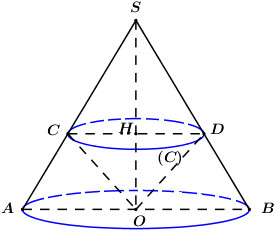 - Giả sử mặt phẳng qua trục cắt hình nón đỉnh \(S\) và đỉnh \(O\) theo thiết diện lần lượt là \(\Delta SAB\) và \(\Delta OCD\).